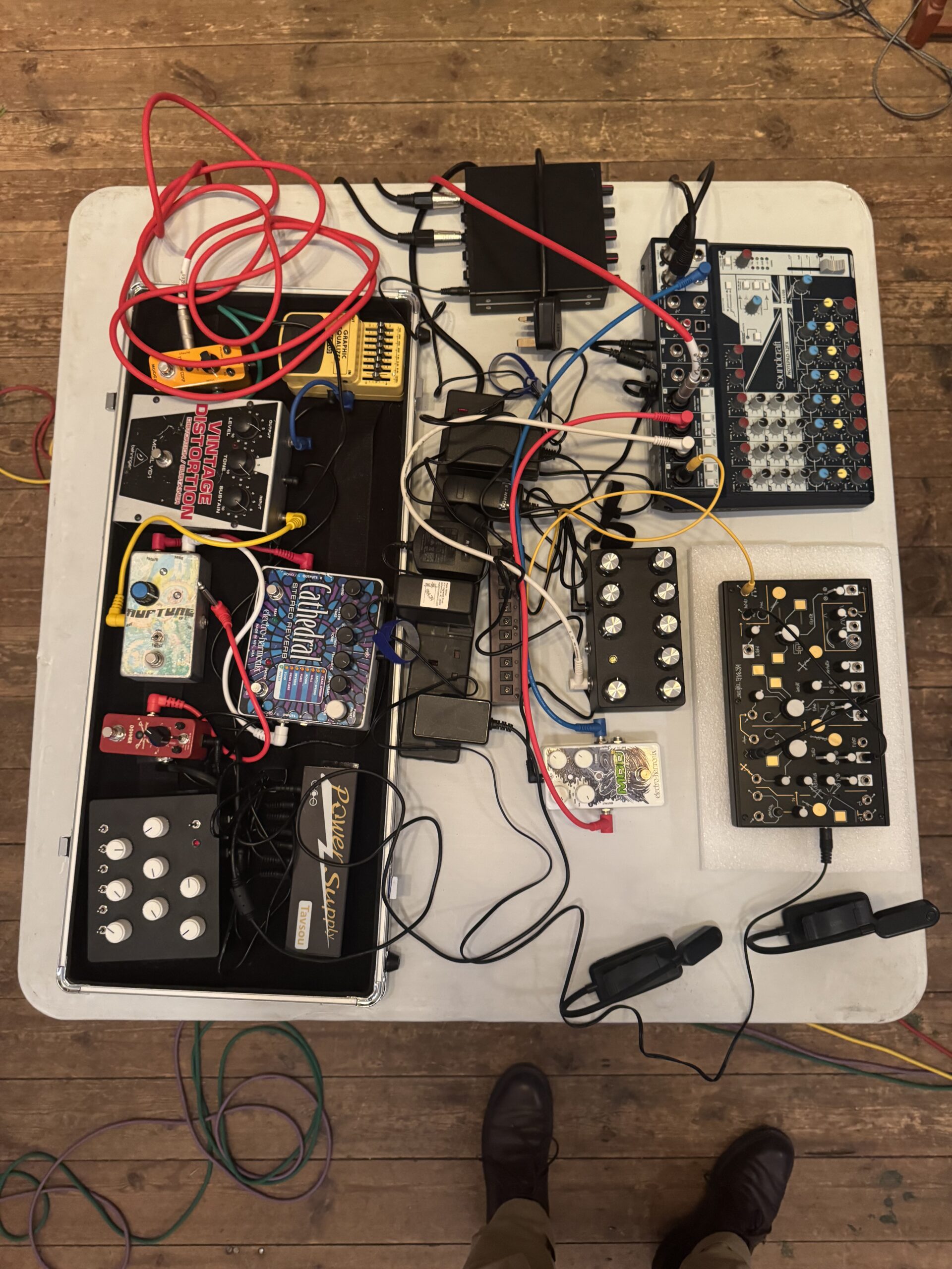 At the front of the room where sermons would normally be delivered and choirs sing hymns, an eclectic group milled around six 1m² foldable tables, setting up what to the layman might look like the controls for the Starship Enterprise; countless flashing lights, knobs and buttons on panels with cryptic symbols all over them; wires snaking over everything and esoteric terminology being thrown around in every direction. A druidic, impressively bearded man plugged something into his setup and the church was suddenly filled by a low, menacing droning sound. A few of the others nodded approvingly. Meanwhile, Levente Dudaš, the night’s organiser, busied himself with his own setup at one of the front tables.